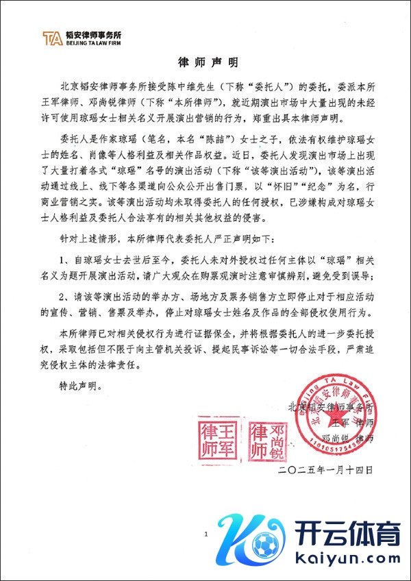 1月14日九游体育app娱乐,著名作者琼瑶的女儿陈中维寄予@韬安讼师事务所针对未经许可使用琼瑶相干方法开展献技营销行径的四肢发布讼师声明。