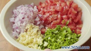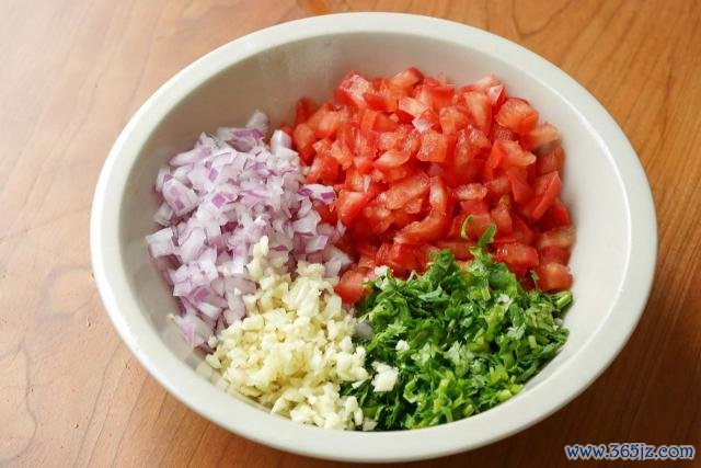 1、1 个番茄洗净切小丁,半个紫洋葱切小丁,1 小把香菜切碎,5 个大蒜粒切末,放入碗中。