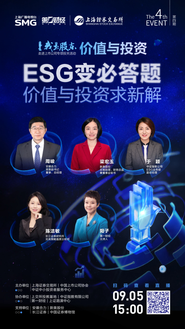 本期节目以“ESG变必答题 价值与投资求新解”为主题,邀致意徽协力党委副布告、董事、总司理周峻、新奥股份总裁助理、财务总监兼董事会秘书梁宏玉共同讨论上市公司ESG建设及发展趋势。同期,中证指数公司ESG业务部副总司理于颖、长江证券商榷所另类策略首席分析师陈洁敏也将手脚特邀嘉宾,与上市公司嘉宾进行互动疏导。