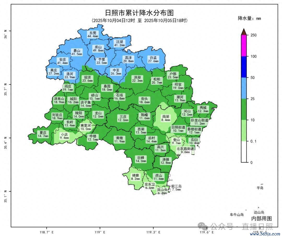 天气实况和预告现金九游体育app平台 一、降水实况 2025年10月04日12时至2025年10月05日18时全市平均降水量18.1毫米,折合水量0.97亿立方米,降水量前三位的站点为:库山水文站53.5毫米,大沈庄水文站47.0毫米,东莞表象站47.0毫米。 各区县平均降水量如下:东港区11.9毫米,岚山区10.7毫米,莒县24.1毫米,五莲县23.5毫米,经济技能开发区9.6毫米,山海天旅游度假区11.8毫米,高新技能产业开发区10.9毫米。 有11个州里街说念出现大雨(25~50毫米),